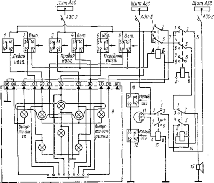 1 — выключатель концевой ДП-702 сигнализации убранного положения левого шасси; 2 — выключатель концевой ДП-102 выпущенного положения левого шасси; 3 - выключатель концевой ДП-702 убранного положения правого шасси; 4 — выключатель концевой ДП-102 выпущенного положения правого шасси; 5 — выключатель концевой убранного положения переднего шасси; 6 — выключатель концевой ДП-102 выпущенного положения переднего шасси; 7 —реле сигнализации шасси; 8 — реле сигнализации закрылков; 9 — пилотажно-посадочный сигнализатор ППС-2МВК; 10,12 - выключатели концевые КВ-9А сигнализации убранного положения шасси па секторах газа; 11 —кнопка отключения сирены; 13 - реле промежуточное; 14 — реле отключения звуковой сигнализации; 15 — сирена С-1