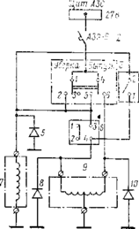 1 — шина на щите АЗС; 2 — выключатель АЗР-б: 3—переключатель 2ППНГ-15К уборки-выпуска шасси; 4 — выключатель ВНГ-15ГК отключения блокировки шасси; 5, 5. 10 — диоды Д'2Н; 6 — выключатель концевой ДП-702 блокировки уборки шасси на земле; 7 — крак электромагнитный ГА-140 зарядки гнд-роппевматического а кку? гул я тор а -т2 (см. рис. 5.1); .9 — кран электромагнитный ГЛМ2/1 уборки-выпуска шасси
