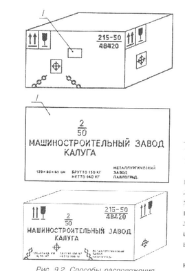 Маркировкой называются различные надписи, рисунки, знаки и условные обозначения, которые наносят на грузовые места. Маркировка указывает на следующее: место назначение груза предписанным путем; способы обращения с грузом при его хранении, перегрузке, перевозки и распаковке; комплектность груза и сохранность его доставки (рис 1). Нанесение маркировки регламентируется Государственными стандартами.