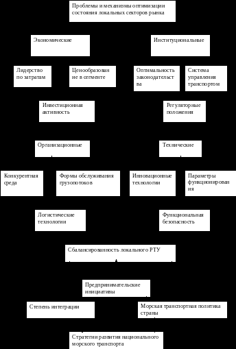 Сложность решения этих задач, как видно из рисунка предопределяется совокупностью проблем, требующих выработки, соответствующих механизмов и инструментария. В структуре механизма нацеленного на сбалансированность локальных рынков выделяются инвестиционные составляющие судоходного комплекса, а также формы обслуживания грузопотоков и достижения функциональной безопасности.