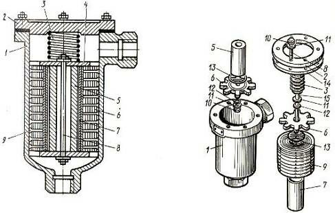 Магнитный фильтр: а в сборе, 6детали; 1 – корпус, 2 – крышка, 3пружина, 4фильтрующий пакет, 5 – магнит, 6 – зубчатая шайба, 7 – труба, 8шпилька, 9 – решетка, 10 – гайка, 11, 12шайбы, 13 – уплотнительное кольцо, 14прокладка, 15 – шпилька с гайкой