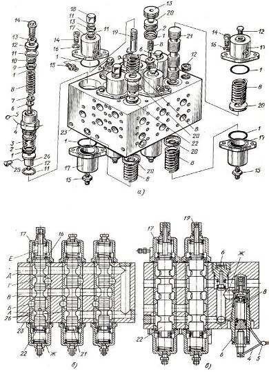 Гидрораспределитель управления гидроцилиндрами рабочего оборудования экскаваторов ЭО-5123: а – общий вид, б, в-разрезы по золотникам и клапанам; 1, 2кольца, 3 – стакан, пружины, 4 – проволока, 5 – пломба, 6 – клапаны, 7 тарелка, 8 пружины, 9 – защитная шайба, 10 – поршень, 11прокладки, 12пробки, 13 гайки, 14, 19 – винты, 15 – штуцера, 16шайбы, 17крышки, 18колпачок, 20 втулки, 21, 22 – золотники, 23 – корпус гидрораспределителя, 24 направляющая втулка, 25 – штифт, 26 – втулки золотников, полости: Аслива жидкости, Б, Г – отвода жидкости к гидроцилиндрам стрелы, В – подвода жидкости от насосов, Д слива жидкости через регулирующий гидрораспределитель, Е, Жгидроуправления золотником