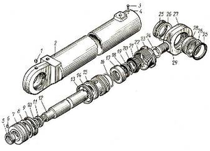 Гидроцилиндр стрелы экскаваторов ЭО-5123: 1, 29масленки, 2 – гильза, 3, 6 – винты, 4контргайка, 5, 23 гайка, 7 – поршень, 8, 10, 14, 19 – защитные кольца, 9, 18, 25манжеты, 11, 13, 16, 20, 26 – резиновые кольца, 12 – шток, 15 – втулка, 17 – стакан, ан, 21грязесъёмник, 22 – скребки, 24 шайба, 27проушин, 28 – подшипник