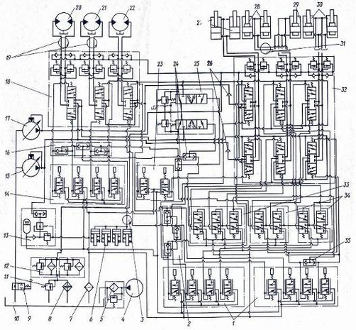 Гидросхема экскаватора: 1, 14 – блоки управления, 2, 16 – блоки клапанов, 3, 19 – центральный коллектор, 4 – ручной насос, 5, 12 – магистральные фильтры, 6 – гидроразмыкатели, 7 – магнитный фильтр, 8 – маслоохладитель, 9 – гидрозатвор, 10 – гидробак, 11 – предохранительный клапан, 13 – пневмогидроаккумулятор с блоком клапанов, 15, 17 – насосы силовой установки, 18, 25, 32 – гидрораспределители, 20 – 22 – гтдромоторы привода гусеничных лент механизма поворота, 23 – педальный блок управления, 24, 35 – клапаны «или», 26 – обратные клапаны, 27 – 30 – гидроцилиндры подъёма стрелы и поворота челюстей грейфера, ковша, рукояти, 31 – вращающееся соединение, 33, 34 – блоки золотников дискретного типа