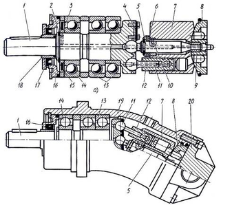 Аксиально-поршневой нерегулируемый унифицированный насос-гидромотор: аунифицированный качающий узел, б – нерегулируемый насос-гидромотор; 1вал, 2 – запорное кольцо, 3, 9, 18втулки, 4пластина, 5 – центральный шип, б – тарельчатые пружины, 7 – блок цилиндров, 8 – распределительный диск, 10 штифт, 11 – шатун, 12поршень, 13, 14шарикоподшипники, 15пружинные кольца, 16, 20 – передняя и задняя крышки, 17манжетное уплотнение, 19корпус