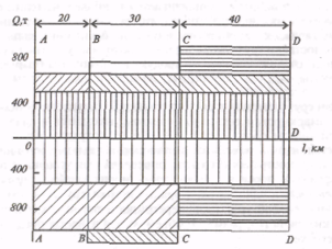 Объем грузов, перевозимых в прямом направлении, откладывают вверх от нулевой отметки, а в обратном – вниз от неё. Для условий, приведенных в табл. 1, прямое направление: DA = ВА + СА + DA + СВ + DC =500 +500 + 100 + 400 = 1500 т, обратное: AD = АВ + АС + AD + ВС т BD + CD = 200 + 500 + 100 +200 + 300 =1300 т.
