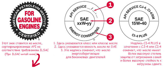 Обозначение класса масла состоит из двух букв латинского алфавита: первая (S или C) указывает категорию масла, вторая — уровень эксплуатационных свойств. Чем дальше от начала алфавита вторая буква, тем выше уровень свойств (т.е. качество масла). Классы дизельных масел подразделяются дополнительно для двухтактных (CD-2, CF-2) и четырехтактных дизелей (CF-4, CG-4, СН-4). Большинство зарубежных моторных масел универсальные - их применяют как в бензиновых, так и в дизельных двигателях. Такие масла имеют двойное обозначение, например: SF/CC, CD/SF и т.д. Основное назначение масла указывают первые буквы , т.е. SF/CC - "более бензиновое", CD/SF- "более дизельное". Энергосберегающие масла для бензиновых двигателей дополнительно обозначаются аббревиатурой ЕС (Energy Conserving).