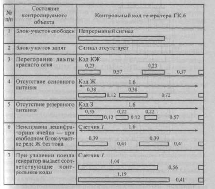 Примеры формируемых кодовых комбинаций на сигнальных установках, посылаемых объектными генераторами при повреждении устройств числовой кодовой автоблокировки, приведены в табл. 1.