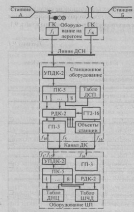 Информация о положении поездов на перегонах с промежуточных станций передается диспетчеру участка. Кроме того, на центральный пост к ДНЦ дополнительно поступает информация о занятости приемоотправочных путей и состоянии входных и выходных светофоров промежуточных станций. Информация со всех промежуточных станций на центральный пост передается по одной двухпроводной физической (воздушной или кабельной) цепи или каналу ТЧ. Каждая станция передает информацию на одной выделенной для нее частоте, формируемой генератором. В канал связи частоты