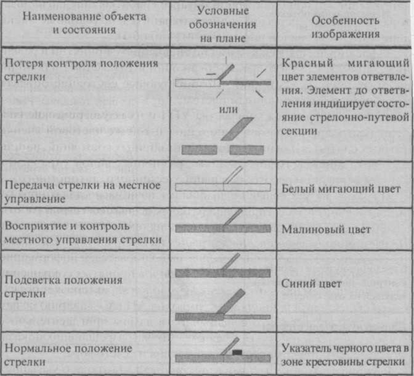 г) расширена цветовая гамма по сравнению с принятой в релейных системах, где часто использован один и тот же цвет для индикации различных состояний. Доминирующее состояние объекта индицируется традиционным цветом;