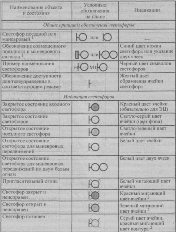В табл.1, 2 приведены примеры условных графических изображений (УГИ) соответственно для светофора и элементов путевого плана.