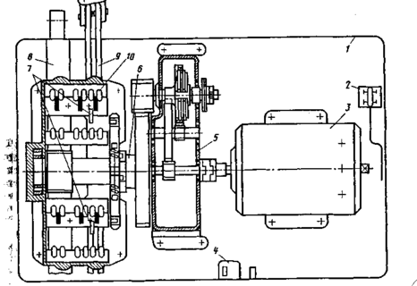 Электродвигатель 3, получая питание с поста управления или от местного источника постоянного или переменного тока, вращает первый из четырех каскадов зубчатых передач редуктора 5. Это вращение передается через диски фрикционной муфты последующим каскадам редуктора и главному валу б, который при переводе стрелки из одного крайнего положения в другое совершает один неполный оборот (280°). Главный вал связан с рабочим шибером 8 посредством кулачкового запирающего механизма, который представляет собой зубчатую передачу реечного типа (рис.4), ведущая шестерня 2 которой расположена на главном валу и имеет специальную форму двух крайних зубьев (зубья скошены, образуя кулачки). Аналогичную форму имеют два крайних зуба рабочего шибера 1. Поэтому в конце привода стрелки, когда скошенные зубья (шестерни главного вала и шибера) входят в соприкосновение, создается упор, препятствующий передвижению шибера и связанной с ним рабочей тяги стрелочной гарнитуры, остряки стрелки оказываются переведенными и запертыми от перемещения стрелочных остряков внутрь колеи. В сторону рамного рельса кулачковый механизм в запирающем положении обеспечивает возможность свободного движения рабочего шибера 8 (см. рис.3) на 12 мм во избежание разрушения привода при проходе поездов по стрелке. Факт запирания остряков кулачковым механизмом не отражает действительного положения стрелочных остряков, поскольку шибер и рабочая тяга, например, могут оказаться разъединенными до и во время перевода стрелки. Запирание должно контролироваться и происходить одновременно с фактическим приведением остряков в крайнее положение. Эти два события контролируются ножевым рычагом 1 (10) автопереключателя (рис.5, а) и скрепленным с ним переключающим рычагом 4 (7). Верхняя часть рычага 4 (7) снабжена роликом, который западает в вырез шайбы 11, насаженной на главный вал в месте сочленения его с редуктором, фиксируя конечное запирающее положение вала и кулачкового механизма. Но замыкание контрольных К контактов 3 (8) автопереключателя возможно, если одновременно в вырезы контрольных линеек прижатого и отведенного остряков западает клювообразный конец ножевого рычага 1 (10).