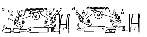 Клювообразная форма конца рычага 1 (10), называемая часто зубом, обеспечивает возникновение зазора между ним и контрольной линейкой Л после его западания в ее вырез, что необходимо при работе привода в динамическом режиме, когда под действием ударных нагрузок при плотном прижатии этих элементов может произойти "срыв" контроля положения стрелки. Замыканию контрольных К предшествуют размыкание рабочих Р контактов 2 (9) и отключение тока электродвигателя. Для снижения коммутационных напряжений это переключение должно происходить по окончании перевода стрелки с большой скоростью. Поэтому переключающие рычага плюсового и минусового положений стягиваются пружиной 6. Контрольные контакты при переводе (рис.5,