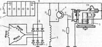 1 —обмотка статора генератора; 2 — акумуляторна батарея; 3 — вимикач «маси»; 4 — транзистор; 5 — вібратор; 6 — обмотка збудження; 7 — діодний міст