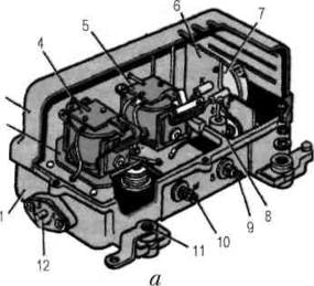 а — будова; б — схема; 1 — корпус; 2 — панель; 3 — кришка; 4 — регулятор напруги; 5 — реле захисту; 6 — тепловідвід; 7 — транзистор; 8 — діод; 9,10,11 — виводи; 12 — перемикач посезонного регулювання; 13 — акумуляторна батарея; 14 — вимикач «маси»; 15 — генератор; 16 — обмотка збудження генератора