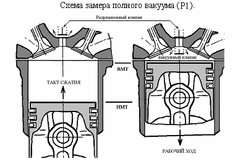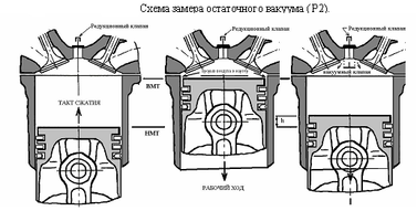 Измерение значения разрежения при расширении в этом случае (опять-таки через вакуумный клапан) позволяет определить остаточный вакуум (Р2), величина которого пропорциональна потерям компрессии при утечке воздуха. При нормальном состоянии колец значение величины Р2 крайне невелико и существенно возрастает при их износе, поломке или закоксовывании.