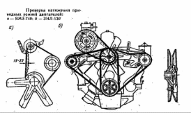 Проверка натяжения приводных ремней вентилятора и водяного насоса производится при помощи специальных приборов и устройств: КИ-8920 (рис.22), К-403 (рис.23, б), которые позволяют определять величину прогиба ремня при заданном усилии (см. табл.1.1)) в наибольших его секторах (рис.23) по периметру. Регулировка натяжения приводных ремней вентилятора и водяного насоса двигателей ЗИЛ, ГАЗ и ЯМЗ-740 производится за - счет перетяжения генератора относительно оси нижних болтов его крепления, а на двигателе ЯМЗ-236-регулировочными прокладками, которые перестанавливаются из внутренней на наружную сторону боковины шкива привода водяного насоса. Запрещается выполнять диагностические и регулировочные операций при работающем двигателе; открывать пробку радиатора при повышенном давлении паров жидкости; опрессовку системы охлаждения проводить на двигателях без ограждения; нагревать воду для испытания термостата в специальных нетермостойких емкостях.