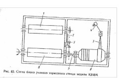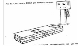 Стенд тормозной, стационарный, роликовый, модель К208М (рис.32). предназначен для проверки тормозной системы с принудительным приводом колес автомобиля. с нагрузкой на ось до 20 QUO Н и. колеей 1100-1800 мм. В конструкцию стенда входят: пульт управления; опорное устройство, состоящее из двух блоков роликов; пневматический подъемник, обеспечивающий свободный въезд автомобиля на стенд; блок подачи воздуха с воздухораспределителем и аппаратный шкаф. На стенде измеряются тормозная сила на отдельных колесах и синхронность срабатывания тормозов колес отдельной оси, время срабатывания тормозного привода и усилие, прикладываемое к педали тормоза через силоизмерительное устройство. Оценка состояния тормозов производится по усилию, измеряемому при прокручивании заторможенных колес автомобиля блоками беговых роликов стенда (рис.83).