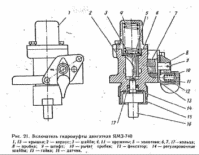 Регулировочные работы по системе охлаждения включают: натяжение до нормы ремня вентилятора, устранение течи в соединениях с шлангами и через сальник водяного насоса, а также промывку системы охлаждения от осадков и удаление из неё накипи. Систему промывают струёй воды под давлением 2-3 кГ/см2 при снятом термостате. Направление промывки должно быть противоположным циркуляции охлаждающей жидкости во время работы двигателя. Регулировка термостата осуществляется вращением регулировочного винта до достижения величины открытия (8,5±0,4) ' мм при нагреве воды около 100 °С. Работа включателя гидромуфты привода вентилятора проверяется непосредственно на рабочем-двигателе при двух положениях рычага пробки крана 10 и подводе дизельного топлива к подходящей полости под давлением 7 кгс/см2 манометру. Если рычаг пробки крана установлен в положении "О" (вентилятор откл), то температура окружающей среды термосилового датчика 16 должна быть 70-75 °С; а если рычаг 10 установлен в положении <В" (автоматический режим), то температура окружающей среды датчиков 85-90 °С.