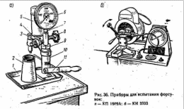 Устройство КИ-4802 (34) предназначено для проверки технического состояния плунжерных пар и нагнетательных клапанов топливных насосов дизелей. Для проверки устройство КИ-4802 присоединяют к одной из секций топливного насоса с помощью накидной гайки топливопровода. Затем, прокручивая двигатель с помощью пускового устройства и плавно включая подачу, доводят давление до 20...25 МПа и прекращают прокрутку. При падении давления до 15 МПа включают секундомер и выключают его при давлении 10 МПа. Если давление, создаваемое плунжерными парами, не ниже 25 МПа (у двигателей с непосредственным впрыском 30 МПа), а время падения давления в указанном выше интервале не менее 10 с, то плунжерная пара и нагнетательный клапан пригодны к дальнейшей эксплуатации.