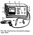Диагностирования двигателя по составу отработавших газов прибором ГАИ-1 (27). Принцип действия прибора ГАИ-1 основан на оптико-абсорбционном методе, т.е. на измерении поглощения инфракрасной (ИК) энергии излучения анализируемым компонентом газа (СО), в результате которого он нагревается до некоторой температуры, зависящей от его концентрации в газовой смеси (отработавших газах). С помощью оптико-абсорбционного датчика температурные колебания испытуемого газа преобразуются в электрические сигналы определенного напряжения, пропорциональные концентрации окиси углерода СО, которые и передаются на измерительный прибор. Перед диагностированием на СО двигатель необходимо прогреть, а непосредственно перед измерением СО дать двигателю проработать не менее 30 с. При измерении содержания СО в отработавших газах газоотборник вставляется в выпускную трубу. Газ засасывается насосом прибора и, пройдя через фильтр, поступает в оптический блок (внутри корпуса), где поглощенная газом ИК-радиация преобразуется в электрический сигнал, пропорциональный концентрации СО и фиксируемый измерителем 4. Результаты контроля сопоставляют с нормативными значениями. Эти нормы должны соответствовать измерениям, которые выполняются при атмосферном давлении 99, 88...101,08 кПа и температуре + 15... 20°С. При снижении давления атмосферного воздуха и повышении температуры смесь, подготовленная карбюратором, как правило, обогащается и выброс СО увеличивается. Следовательно, с учетом этих изменений необходимо делать соответствующую поправку к показанию прибора. Например, при температуре воздуха + ЗО...35°С и давлении 95,89...97,09 кПа показания газоанализатора надо умножить на коэффициент 0,76.7. Ознакомиться с принципом действия прибора ИКС-1. Основой прибора ИКС-1 (28) является свеча зажигания с прозрачным окном. Ее вворачивают вместо одной из средних свечей зажигания на время регулировки карбюратора на качество горючей смеси. К прибору прилагается комплект насадок и поворотное зеркальце, что обеспечивает удобство его применения на различных двигателях. Если пламя, наблюдаемое в зеркальце, имеет оранжевый цвет, это свидетельствует о богатой смеси, а следовательно, и высоком содержании СО в отработавших газах. Медленным заворачиванием винта качества карбюратора нужно добиваться, чтобы оранжевый цвет пламени перешел в голубой. Голубой цвет пламени свидетельствует об оптимальном составе смеси, а светло-голубой цвет является признаком переобеднения смеси, которое, как и переобогащение, нежелательно. Индикатор ИКС-1 позволяет за 5...10 мин довести до нормы (за счет регулировки карбюратора) содержание окиси углерода в отработавших газах карбюраторных двигателей самых различных моделей как легковых, так и грузовых автомобилей.