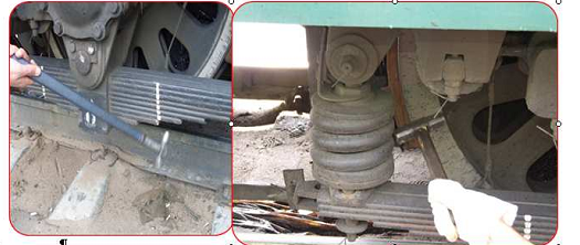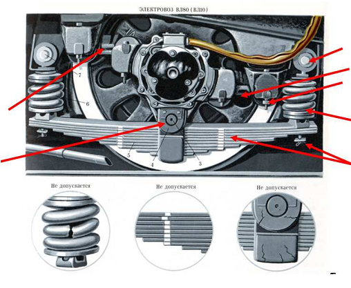 Проверяется состояние буксовых рессор, отсутствие трещин в листах, хомутах листовых рессор и витках спиральных пружин. Ослабление листов в хомуте определяем простукиванием молотком. Звонкий звук характеризует нормальное состояние узлов рессорного подвешивания, глухой звук указывает на необходимость обратить внимание и более тщательно осмотреть этот узел локомотива. Отсутствие сдвига у листовых рессор определяем простукиванием и по контрольным полоскам.