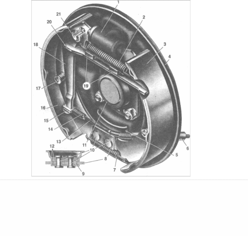 Рис.7.3. Гальмовий механізм заднього колеса: 1 - колісний циліндр; 2 - верхня стяжна пружина колодок; 3 - накладка колодки; 4 - щит гальма; 5 - внутрішня пластина; 6 - оболонка заднього троса; 7 - нижня стяжна пружина колодок; 8 - передня гальмова колодка; 9 - опорна пластина колодок; 10-заклепки; 11 - оливовідбивач; 12 - направляюча пластина колодок; 13 - задній трос стоянкового гальма; 14 - пружина заднього троса; 15 - накінечник заднього тросу; 16 - задня гальмова колодка; 17-опорна стійка колодки; 18-важіль ручного приводу колодок; 19 - гумові подушки; 20 - розпірна планка колодок; 21 - палець важеля ручного приводу колодок.