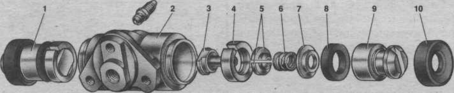 Рис. 7.2. Деталі колісного циліндра: 1 - поршень у зборі; 2 - корпус циліндра; 3- упорний гвинт; 4 - упорне кільце; 5 - сухарі; 6 - пружина; 7 - опорна чашка; 8 - ущільнювач; 9 - поршень; 10 - захисний ковпачок.