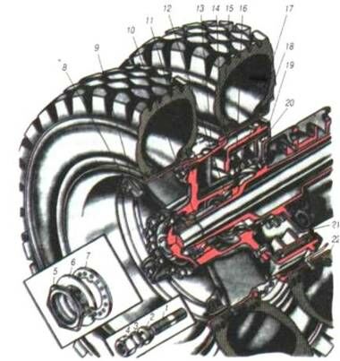 ис. 4.1. Встановлення заднього колеса: 1 — шпилька кріплення напівосі; 2 — розтискна втулка; 3 — пружинна шайба; 4,5 —гайки; 6 — шайба відгинна; 7 — шайба замкова; 8 — гайка; 9 — притиск; 10, 12— підшипники; 11 — маточина; 13 — проставочне кільце; 14 — замкове кільце; 15 — кільце манжети; 16 — бортове кільце; 17 — маслоуловлювач; 18 — гальмовий барабан; 19 — супорт; 20 — щиток гальма; 21 — колодка гальма з накладками; 22 — шина