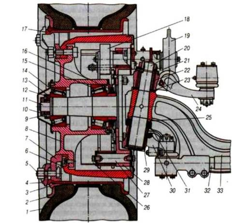 Рис. 2.1. Передня вісь і маточина з колесом: 1 — шина; 2 — бортове кільце; 3 — замкове кільце; 4 — притиск; 5 — болт; 6 — гальмовий барабан; 7 — диск; 8 — маточина; 9 — стопорна шайба; 10 — контргайка; 11 — поворотний кулак; 12 — замкова шайба; 13 — гайка маточини; 14, 15 — підшипники; 16 — манжета; 17 — обід; 18 — розтискний кулак; 79 — регулювальний важіль; 20 — шворінь; 21 — сталева втулка; 22,29 — бронзові втулки; 23 — регулювальні шайби; 24 — важіль подовжньої рульової тяги; 25 — сферична шайба; 26 — гальмова колодка; 27 — вісь гальмових колодок; 28 — супорт; 30 — важіль поперечної рульової тяги; 31 — підшипник шворня; 32 — поперечна рульова тяга; 33 — балка передньої осі