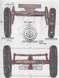 Колеса, на які через трансмісію передається крутний момент від колінчастого вала двигуна, називаються ведучими (рис. 3, а). Колеса, за допомогою яких змінюють напрямок руху трактора, називають напрямними (рис. 3, б). У тракторів Т-40А, МТЗ-82, ЮМЗ-8280, Т-150К, К-700 напрямні колеса, змінюючи напрям руху трактора, одночасно і ведучі. Такі трактори мають підвищену прохідність. Для зручності класифікації колісних тракторів за ходовою частиною прийнято колісну формулу, яка складається з двох цифр, з'єднаних між собою буквою К. Перша цифра означає загальне число коліс трактора, друга — число ведучих коліс. Універсальні — це просапні трактори з чотирма колесами, з яких 2 — ведучі (позначається 4К2), а якщо у такого трактора всі колеса ведучі, то позначення буде 4К4. Передній міст трактора залежно від призначення може мати різні конструкції. Найбільше розповсюдження мають мости з регулюючою колією коліс, які встановлюються на універсально-просапних тракторах. Такий міст складається із трубчастої балки 1 (рис. 4) і двох поворотних кулаків 2, в яких розміщено осі 3 поворотних цапф 4. Трубчаста балка шарнірно з'єднана з вушками переднього бруса остова трактора. Щоб збільшити стійкість трактора при його русі і полегшити керування ним, колеса встановлюють не перпендикулярно до опорної площини, а під певними кутами:
