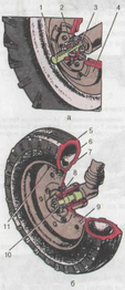 Борти 4 — жорсткі частини покришки, призначені для закріплення покришки на ободі колеса. Камера — це замкнута кільцева трубка з еластичної гуми товщиною 1,5.5 мм, залежно від розмірів покришки. Через вентиль, встановлений в камері, накачують (випускають) стиснуте повітря. Вентиль (рис. 5, г) складається з корпуса і золотника 7, зверху закривається ковпачком 6. Від тиску повітря в пневматичній шині залежить її довговічність. Підпружна дія пневматичної шини залежить від навантаження на неї і внутрішнього тиску повітря. Нормальний тиск — це тиск, рекомендований заводом-виготівником, забезпечує найвигіднішу деформацію шини в період роботи трактора, зменшує руйнування ниток каркасу і забезпечує добре зчеплення колеса з ґрунтом (рис. 5, д). Від підвищення тиску шина стає чутливішою до ударів і порізів на перешкодах, прискорює процес утомленості каркасу, що призводить до його передчасного розриву. При цьому погіршується зчеплення колеса з ґрунтом. Знижений тиск збільшує підпружність і деформацію шини і каркас швидко виходить з ладу, зчеплення з дорогою на твердому ґрунті погіршується. Тому, залежно від виду роботи трактора і його марки, необхідно змінювати і величину внутрішнього тиску в шинах. Підвіска з'єднує остов з колесами і пом'якшує поштовхи і удари, що виникають під час руху трактора, а також застосовується для підвищення плавності руху. Незалежна підвіска не має жорсткого зв'язку осей коліс з балкою передньої осі, тому основну силу поштовхів сприймають колеса, а не остов трактора. Пружні пристрої, пом'якшуючи поштовхи і удари, які сприймаються колесами трактора, складаються з листових ресор або амортизаційних пружин. Листова ресора 6 (рис. 6, а) виготовлена з пружних вигнутих стальних листів різних розмірів. Кінці ресори встановлюють в гумові подушки, закріплені в кронштейнах 3, приклепаних до рами трактора. Ресора за допомогою підкладок 5 і хомутів 1 закріплена до корпусу переднього моста. Хід ресори при поштовхах обмежується гумовим буфером 2. Для покращення плавності ходу трактора на підвіску переднього мосту тракторів Т-150 і К-700 встановлюють телескопічні гідравлічні амортизатори двосторонньої дії 4, які "гасять" коливання ресор при наїзді колеса на перешкоду. Їх робота заснована на тому, що при відносних переміщеннях підресорених і непідресорених мас трактора масло в амортизаторі перетікає з однієї його порожнини в іншу через невеликі отвори, внаслідок чого створюється опір, який поглинає енергію коливальних рухів. На тракторах МТЗ-80, МТЗ-82 в кронштейнах наконечників передньої осі діють циліндричні амортизаційні пружини (рис. 6, б), які внизу спираються в упорні кулькові підшипники 9, а зверху — в стінки наконечників. Для зменшення ударного навантаження при повному стискуванні пружини на вісь цапфи надівають гумовий буфер або тарілчасту пружину 10. В конструкції незалежної підвіски тракторів Т-40А встановлюють дві циліндричні пружини (рис. 6, в).