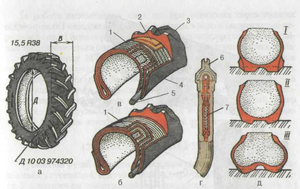 а — загальний вигляд; б — розріз діагональної шини; в — розріз радіальної, шини; г — вентиль; д — тиск повітря в шинах; 1 — каркас; 2 — подушковнй шар (брекер); 3 — протектор; 4 — борт; 5 — дротяні кільця; 6 — ковпачок вентиля; 7—золотник; І—нормальний тиск; II—підвищений тиск; III—знижений тиск