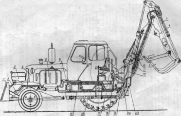 Екскаватор монтується на базі колісного трактора 4 (Рис. 1.), до якого кріпляться обв'язувальна рама 17 і дишель бульдозера, призначені для розвантаження остова трактора й навішення робочого устаткування. В обв'язувальній рамі установлена поворотна колонка 14 з ланцюговим механізмом повороту. Для підвищення стійкості екскаватора в роботі до рами прикріплені опорні башмаки 13 із приводом від гідроциліндрів 15.