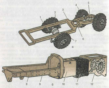 б — остов просапного трактора; 1 — підвіска; 2 — передній міст; 3 — остов; 4, 7 — задні і передні колеса; 5 — задній міст; 6 — подвійний шарнір; 8 — передня балка; 9 — поздовжня балка (лонжерон); 10 — корпус зчеплення; 11 —корпус коробки передач; 12 — корпус заднього моста