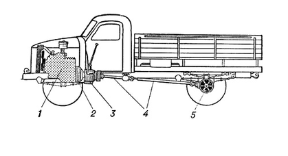 Рис. 1. Трансмісія автомобіля: 1 – двигун; 2 – зчеплення; 3 – коробка передач; 4 – карданна передача; 5 – головна передача і диференціал.