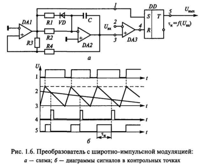 Преобразование непрерывной величины с амплитудной модуляцией в сигнал с широтно-импульсной модуляцией можно осуществить с помощью устройства, схема которого, а также диаграммы, поясняющие принцип его работы, приведены на рис.1.6. Устройство содержит генератор линейно изменяющегося напряжения (ГЛН), выполненный на операционных усилителях DA1, DA2, устройство сравнения УСр, выполненное на операционном усилителе DA3, и триггер DD.