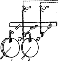 Передача усилия по линии гибких тяг возможна только при ее натяжении, что достигается с помощью грузов компенсатора 2. Чтобы перевод рычага 1 не приводил к подъему одного груза и опусканию другого, компенсатор 2 дополняется стопорным механизмом в виде зубчатой рейки и зажимным устройством, соединенным с обоими грузовыми рычагами. При изменении температуры среды обе тяги одинаково удлиняются или укорачиваются, и грузы перемещаются одновременно, чему зубчатая рейка не препятствует. Во время перевода стрелки натяжение в тягах различно, поэтому один из зажимов стопорного механизма входит в соприкосновение с зубьями рейки и препятствует дальнейшему подъему груза. Все прикладываемое усилие затрачивается на перемещение тяг.