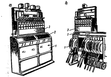 Распорядительный аппарат (рис.1.2, а) имеет станину 1, ящик механических зависимостей между маршрутами 2 и блок-аппарат 3. В последнем устанавливаются блок-механизмы и индуктор, а на передней стенке - звонки, кнопки, электрические замычки постоянного и переменного тока. На соответствующих осях ящиков зависимости закрепляются маршрутные и сигнальные трехпозиционные рукоятки. В нормальном состоянии маршрутные блок-механизмы отблокированы, сигнальные блок-механизмы заблокированы, поэтому маршрутные рукоятки свободны и могут поворачиваться для задания маршрутов, сигнальные рукоятки замкнуты. Расположенный на посту управления или в отдельно стоящем в горловине станции здании исполнительный аппарат (рис.1.2, б) имеет рычажную станину 1, ящик зависимости 2 и блок-аппарат 3. На рычажной станине устанавливаются стрелочные и сигнальные рычаги. Блок-аппарат имеет маршрутные и сигнальные блок-механизмы, блокировочный индуктор и вызывные приборы. Маршрутные и сигнальные рукоятки исполнительных аппаратов двухпозиционные и нормально замкнуты.