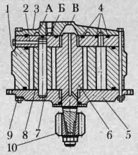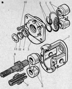 Шестерінчастий гідромотор (Рис. 2.3.). Корпус 1 гідромотора зверху закритий кришкою 3, через порожнини А и Б якої підводиться робоча рідина, а через дренажну порожнину В - приділяються витоки. Гідромотор містить у собі три ведучі шестірні 8 (у розрізі видна одна шестірня), що вільно обертаються на осях 7 до, що приводять у рух відому шестірню 6, виготовлену заодно з валом. За допомогою шайби 2 розподіляється рідина, що надходить через порожнини А и Б. Нижня кришка 5 служить одночасно фланцем для кріплення гідромотора. Усі деталі гідромотора стягнуті по периметрі болтами 9.