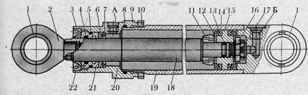1 - сферичний підшипник, 2 - вушко штока, 3 - брудознімач, 4, 5, 8, 13- ущільнювальні кільця, 6, 14 манжети, 7, 12 - манжетодержатели, 9- передня кришка, 10 - контргайка, 11-демпфер, 15 - поршень, 16 - гайка поршня, 17 - шплінт, 18 - шток, 19 - гільза гідроциліндра з задньою кришкою, 20 - крайка кришки, 21-втулка передньої кришки, 22 - гайка брудознімача