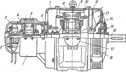 1 — станина збудника, 2 — колектор збудника, 3 — підшипниковий щит збудника, 4 — якір збудника, 5 — полюс збудника з обмоткою, 6 — шарикопідшипник, 7 — передній підшипниковий щит синхронної машини, 8 — станина синхронної машини, 9 — сердечник статора машини, 10 — обмотка статора машини, // — задній підшипниковий щит, 12 — полюс ротора з обмоткою, 13 — вентилятор, 14 — втулка, 15 — роликовий підшипник, 16 — вал ротора, 17 — коробка вивідних затисків, 18 — сітка на вентиляційному вікні підшипникового щита гвинта,