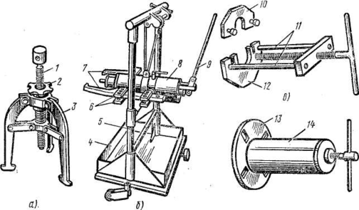 а — гвинтовий знімач з регульованим розкриттям тяги, би — гідравлічний знімач, в — знімач для стягнення підшипників каченія захопленням за підшипник, г — знімач для стягнення підшипників каченія захопленням болтами за кришки або капсули підшипника; / — черв'ячний гвинт з головкою, 2 — регулювальна гайка, 3 — тяга (захоплення), 4 — майданчик, 5 — стійка, 6 — траверси, 7 — захоплення, 8 — плунжерний насос, 9 — рукоятка штока насоса, 10 — пластинка з штифтами, // — шпильки, 12 — плита, 13 — диск, 14 —