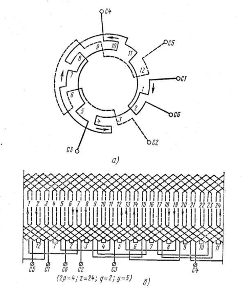 На мал. 5 а приведена торцева схема двошарової обмотки статора чотирьохполюсної машини, а на мал. 5, би — відповідна їй розгорнена схема.