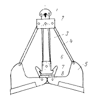 1 – скоба; 2 – верхняя траверса; 3 – канат; 4 – тяги; 5 – челюсти; 6 – подвижная головка; 7 – захваты; 8 – нижняя траверса;