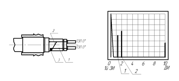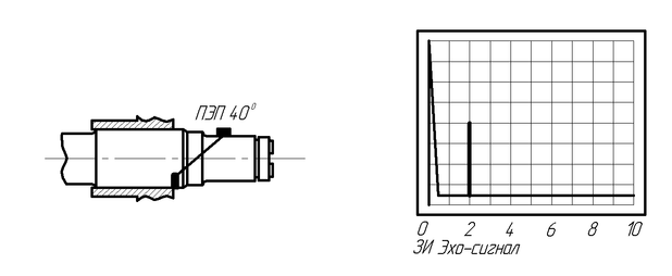 | Настройка чувствительности дефектоскопа для проведения УЗК осей со снятыми кольцами подшипников а) 1-й этап - для проверки наружных шеек осей. Для выполнения УЗК наружных шеек осей со снятыми кольцами подшипников браковочную чувствительность N5 настраивают по эхо-сигналу от пропила в шейке оси глубиной 1 мм на расстоянии от торца 265 мм в КО. Для этого прямой ПЭП (П111-2,5-К12) устанавливают на торец оси (рис. 3), получают эхо-сигнал от пропила и кнопками аттенюатора доводят его до средней линии экрана ЭЛТ (рис. 4). Показания аттенюатора N5 заносят в журнал установленной формы, приведенной в ТИ.