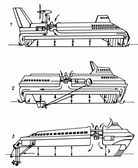 1 — амфибийное судно с воздушным винтом; 2 — полуамфибийное судно с водяным гребным винтом; 3 — судно с бортовыми ограждениями воздушной подушки (со скегами) и с Z-образным приводом на водяной гребной винт.