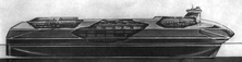 Боковой вид и поперечное сечение трансокеанского судна на воздушной подушке со скегами (проект)