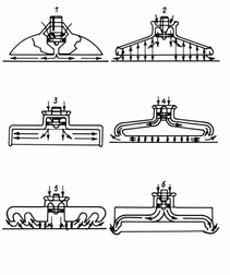 1 — с центральным соплом; 2 — камерная схема с юбкой (гибким ограждением); 3 — камерная схема с жесткими бортовыми ограждениями (скегами); 4 — схема без юбки с кольцевым соплом по периметру подушки; 5 — схема с лабиринтным уплотнением; 6 — схема с юбкой и кольцевым соплом по периметру подушки