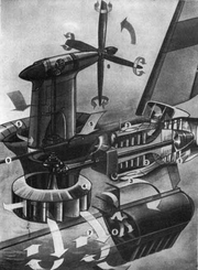 На рисунке справа привод главного вентилятора и воздушного винта от одной газовой турбины на амфибийном судне на воздушной подушке: 1 — газовая турбина; 2 — компрессор газовой турбины; 3 — камера сгорания; 4 — главный вентилятор; 5 — воздухоприемники главного вентилятора; 6 — юбка (гибкое ограждение воздушной подушки); 7 — воздушная подушка; 8 — толкающий воздушный винт регулируемого шага; 9 — рулевой валик с червячным приводом для изменения направления упора (для поворота судна)